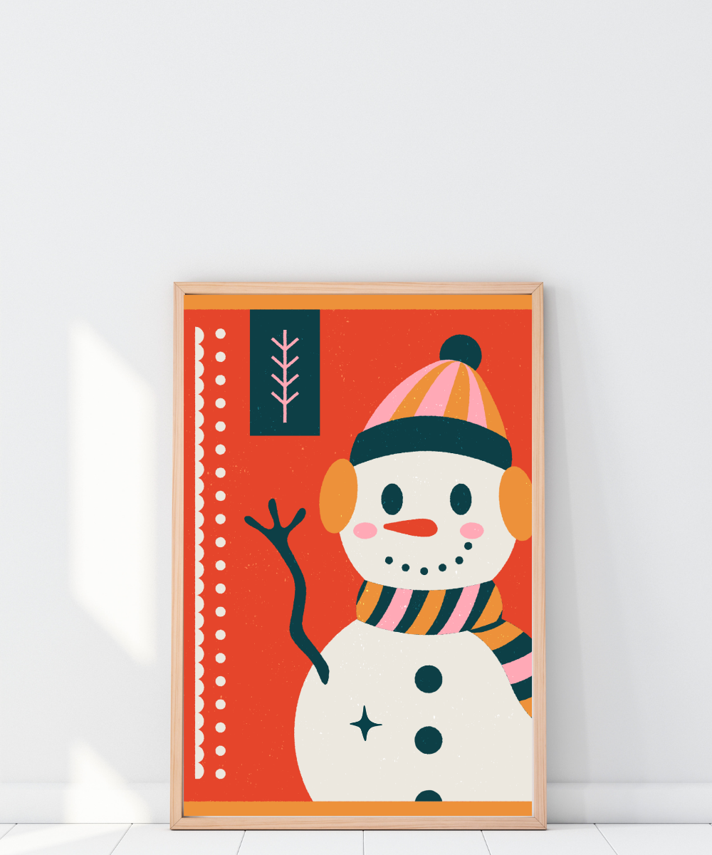 • Snjegović: Veseli, stilizirani snjegović s prugastom kapom i zaštitnim slušalicama, prikazan na energičnoj crveno-narančastoj pozadini.