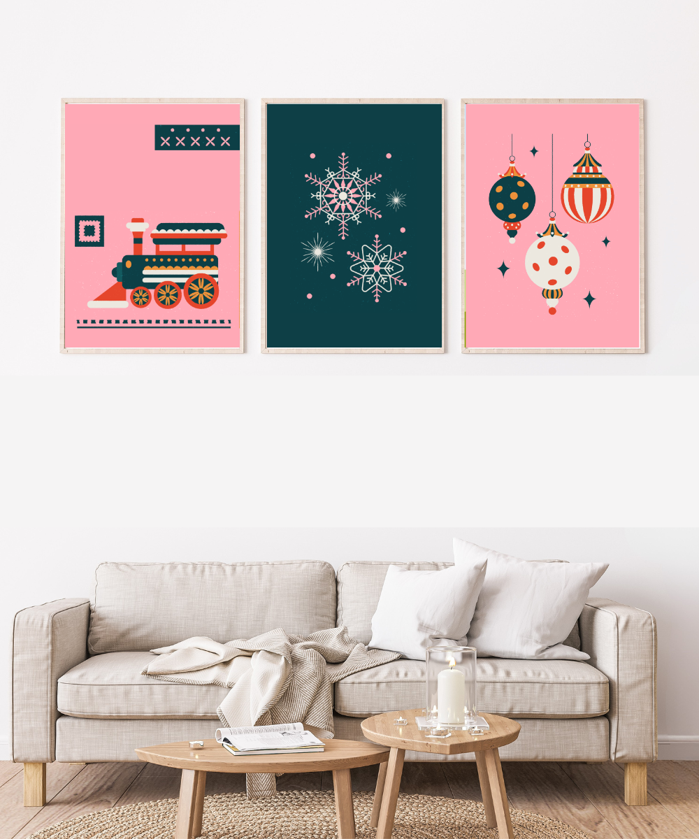 Ovaj neodoljivi set od tri plakata stvara savršenu vintage blagdansku atmosferu. Odlikuje ga izražena paleta tamnozelene (teal), ružičaste i narančaste boje, a motivi su inspirirani dječjom maštom i zimskim veseljem. Ovi plakati unijet će jedinstven, moderan i zaigran štih u vaš dom, idealno za dječje sobe ili kao akcent u dnevnom boravku.