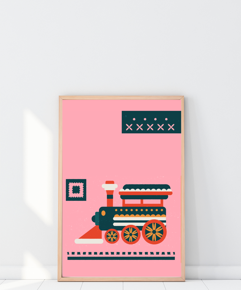 - Božićni Ekspres (Vlak): Šarmantna ilustracija stilizirane lokomotive u rozim i tamnozelenim tonovima. Priziva osjećaj putovanja i uzbuđenja iščekivanja blagdana.
