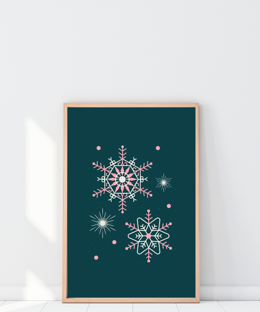 - Čudesne Pahuljice: Elegantan, grafički prikaz snježnih pahuljica u ružičastoj i bež boji na dubokoj tamnozelenoj pozadini. Savršeno utjelovljenje zimske čarolije.