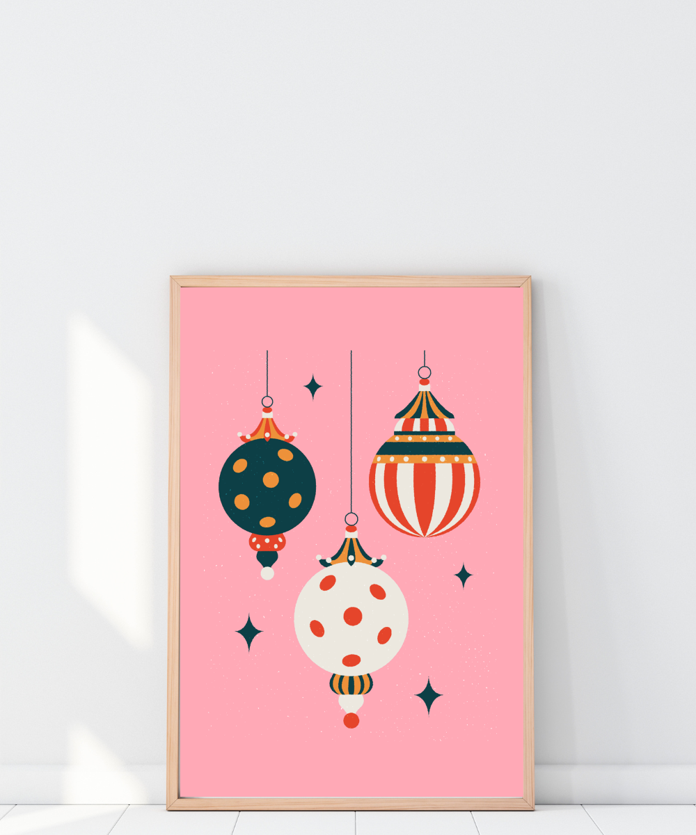- Retro Kuglice (Ornamenti): Tri viseća, stilizirana božićna ornamenta u prugastom i točkastom uzorku, na veseloj ružičastoj pozadini. Unose dinamičnost i boju u prostor.